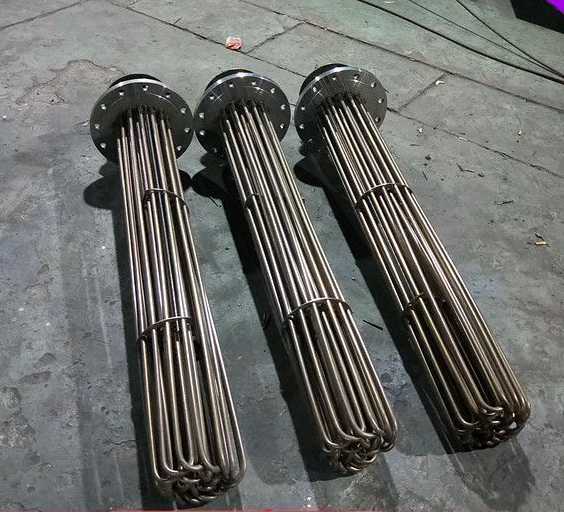 法蘭電加熱管(也稱插入式電加熱器):是采用U型管狀電熱元件,依據加熱不同介質設計規范,按照功率配置要求裝配在法蘭蓋上,插入需加熱物料中,發熱元件工作時所發出的大量熱量傳導給被加熱介質使介質溫度升高,達到所需的工藝要求。當介質溫度達到工藝要求的設定值時,控制系統根據溫度傳感器信號,經PID 運算后調節電加熱器輸出功率,對發熱元件的電阻性負載實現溫度控制。使介質溫度均勻,達到所需要求;當發熱元件超溫或低液位時,發熱元件的聯鎖保護裝置立即切斷加熱電源避免發熱元件燒壞,延長使用壽命。